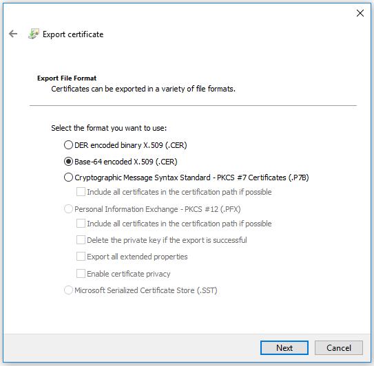 Clicking “Next” will prompt you to select the format of the exported certificate file, and the location it should be saved.