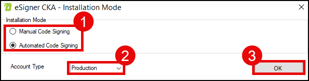- For installation mode, click the radio button for Automated Code Signing. For Account Type, choose Production or Sandbox, depending on the type of your SSL.com account. Click the OK button to proceed.