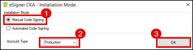 - For installation mode, click the radio button for Manual Code Signing. For Account Type, choose Production or Sandbox, depending on the type of your SSL.com account. Click the OK button to proceed.