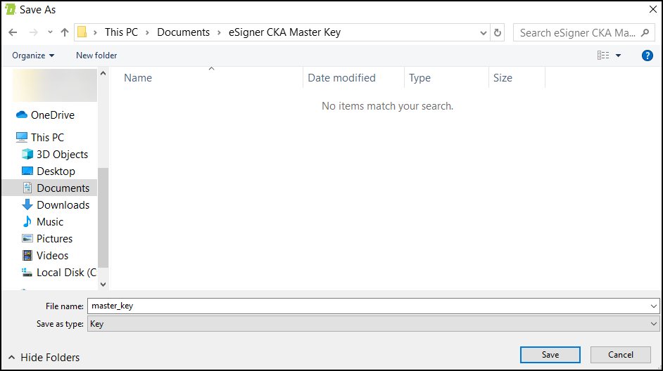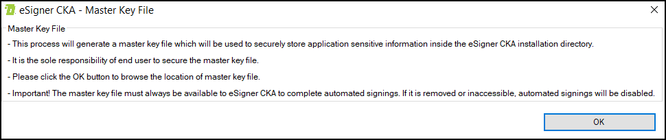- Read about the importance of securely storing the Master Key File in your computer. The master key file must always be present for automated signings using eSigner CKA. Click the OK button to choose where to store your Master Key File.