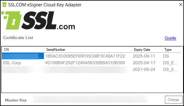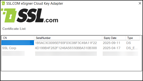 - After a brief loading period, eSigner CKA will load your eSigner-enrolled certificates to your computer Windows certificate store. All certificates that are successfully loaded will be displayed by eSigner CKA.