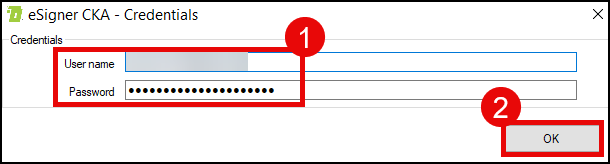 - eSigner CKA will then require you to place the credentials for the SSL.com account you are using. If you or your organization has multiple SSL.com accounts, login to the one where the signing certificates have been issued and enrolled in eSigner. Click the OK button to proceed.