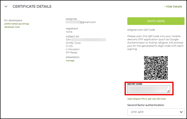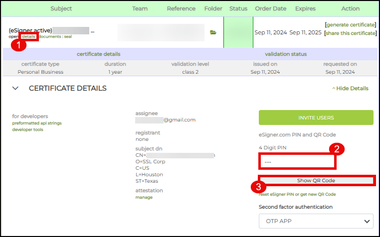 On your SSL.com account order page, identify the Common Name (CN) of the signing certificate. Click the details link to display specific information about the certificate. On the 4 Digit PIN box, place the PIN you previously generated when you enrolled the certificate in eSigner. Next, click the Show QR Code button.