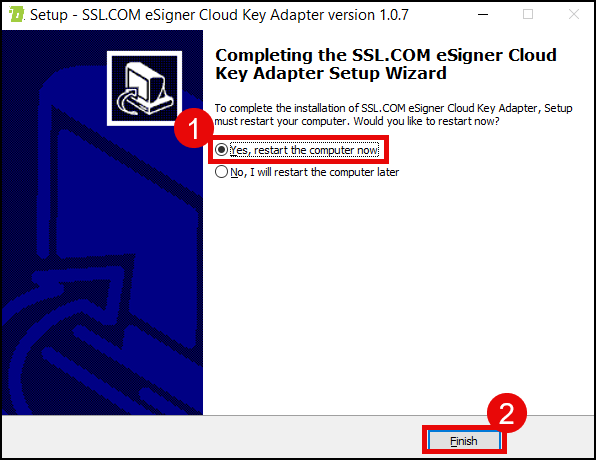 - To complete the installation of eSigner CKA, click the radio button for Yes, restart the computer now and then click the Finish button.