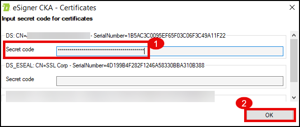 - On eSigner CKA, place the secret code of all signing certificates that you want to be loaded to Windows Certificate store. Afterwards, click the OK button.