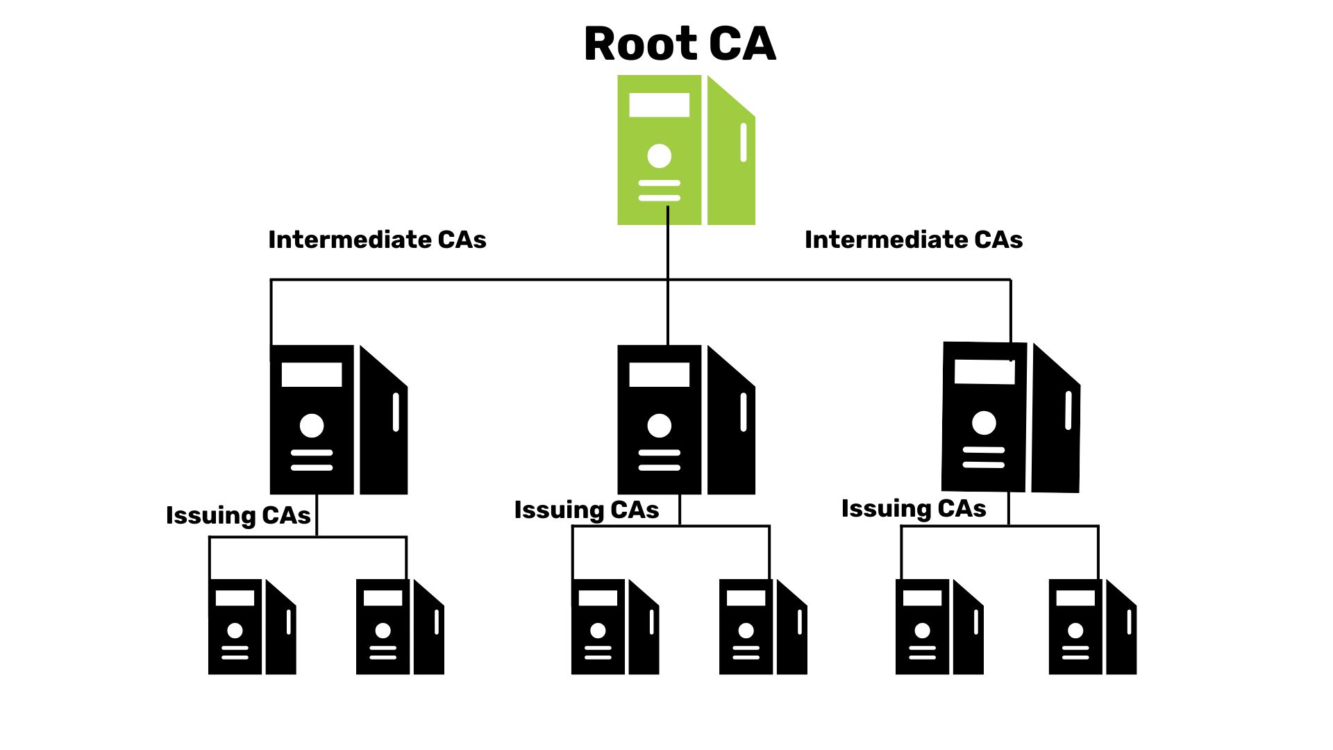 CAs come in two categories. Root CAs form the peak of the hierarchy, while intermediate CAs distribute certificates under them.