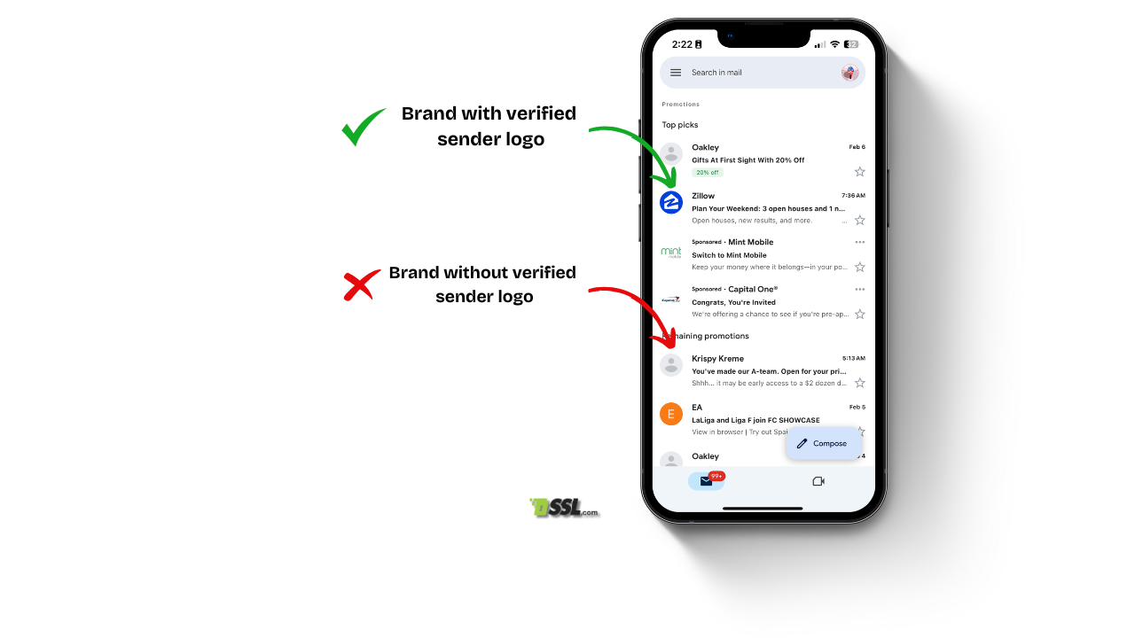 Protect your organizational email communications with SSL.com’s Verified Mark Certificates (VMC). Our Verified Mark Certificates allow your brand logo to appear right next to your sender name, giving recipients immediate visual confirmation of your authenticity.