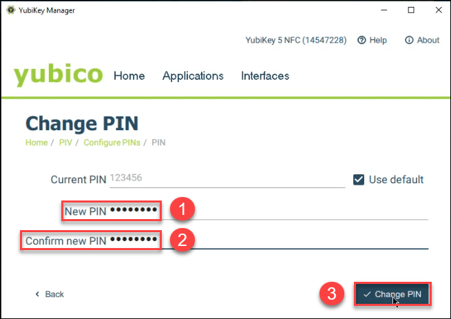 - Enter the PIN into the New PIN field of the YubiKey Manager and then re-enter the PIN into the Confirm New PIN field. Select Change PIN to lock-in the changes.