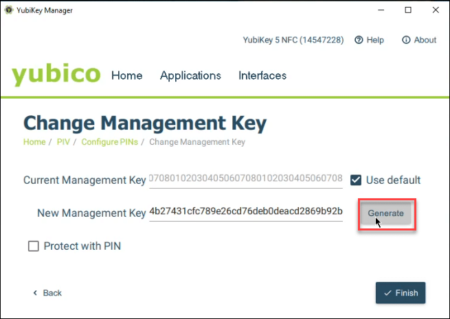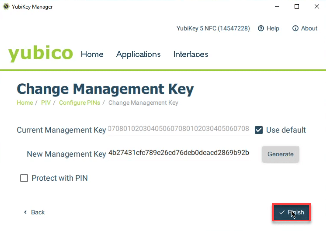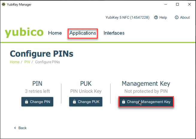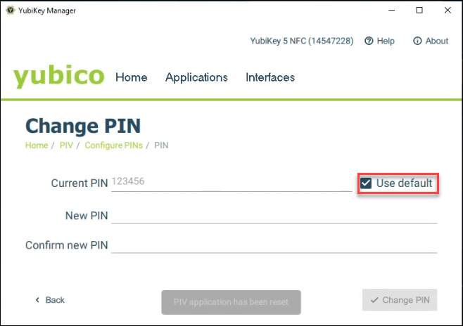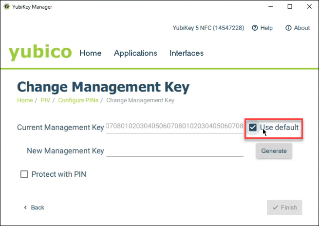From Applications > PIV > Configure PINs, select Change Management Key. - Check the box for Use Default.