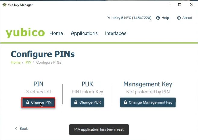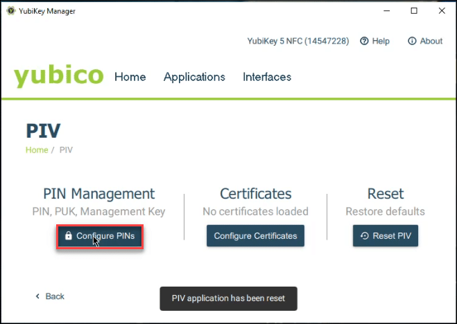 - Navigate to Applications > PIV > Configure PINs.