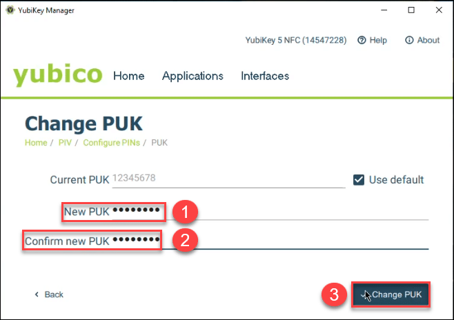 - Enter the PUK into the New PUK field of the YubiKey Manager and then re-enter the PUK into the Confirm New PUK field. Finally, select Change PUK to lock-in the changes.