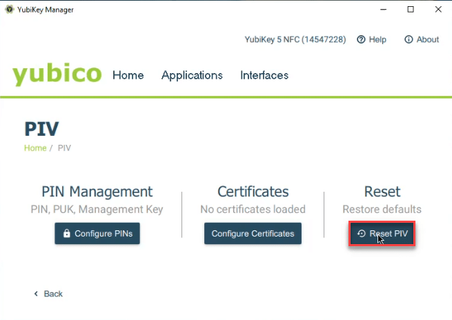 - Navigate to Applications > PIV > Reset PIV, when prompted confirm the action by clicking “yes”. This will remove ALL certificates stored on the Yubikey.