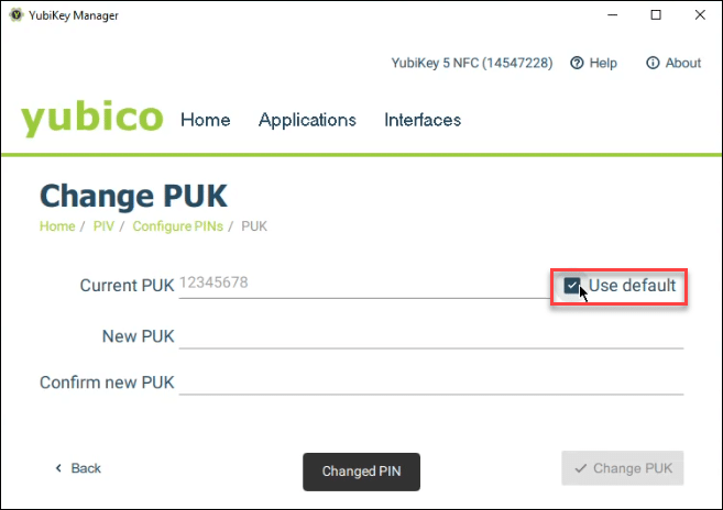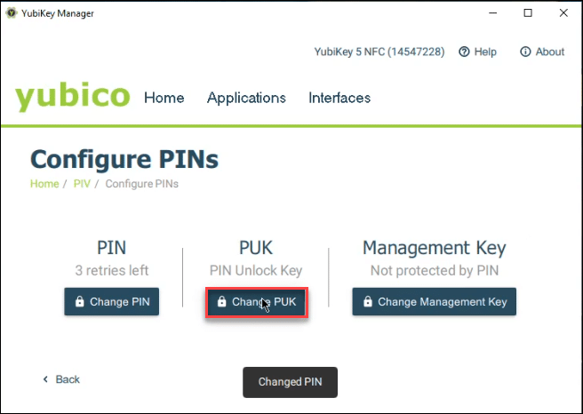 - You will then be redirected back to the PIV menu. From Applications > PIV > Configure PINs, select Change PUK.