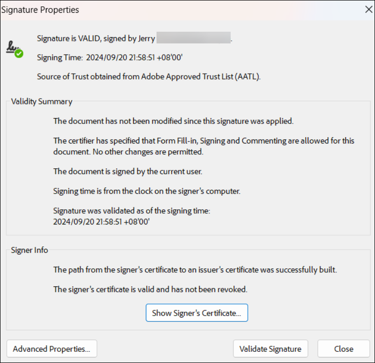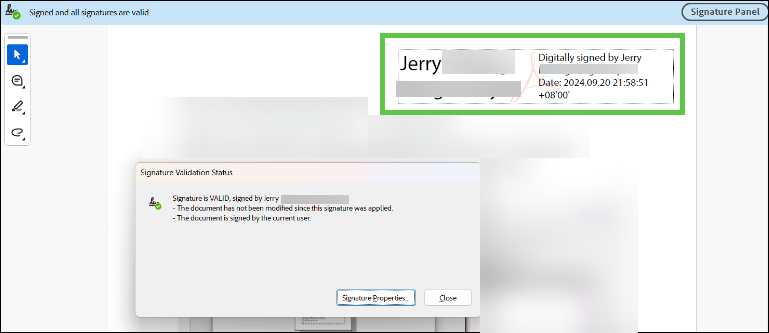 - Check the visible signature. Adobe Acrobat will confirm that the digital signature applied to the file is valid.