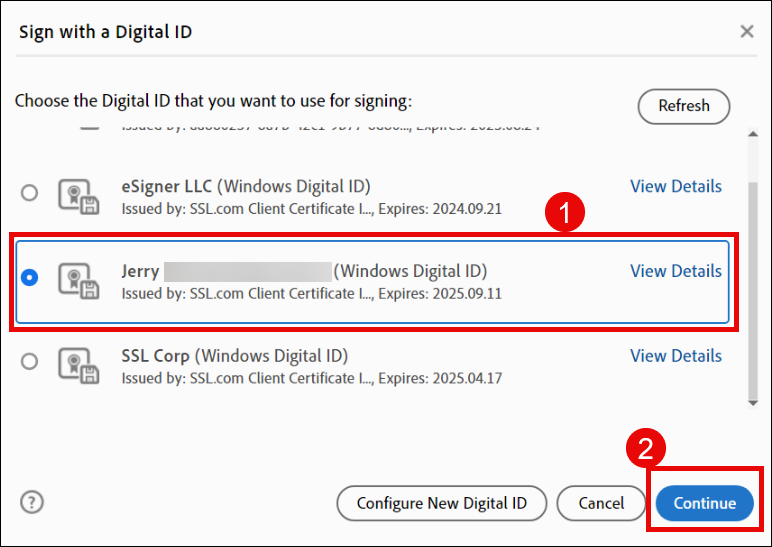 - Select the SSL.com document signing certificate you want to use and then click the Continue button.