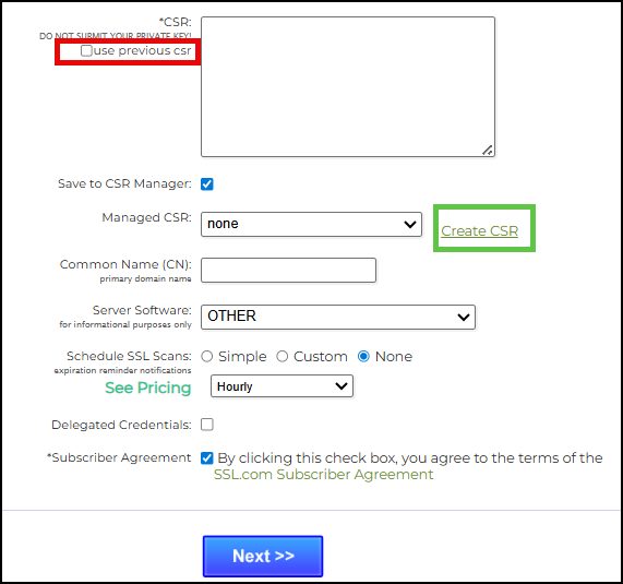 - Re-use your CSR if organization details stay the same. For this option, click the check box for use previous csr.