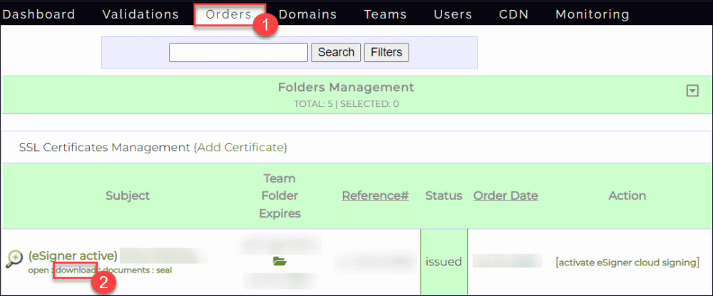 Login to your SSL.com customer account, Click the Orders tab on the Menu and choose the particular order that you want to be revoked of eSigner subscription. Next, click the download link for that order to show all the information for your certificate.