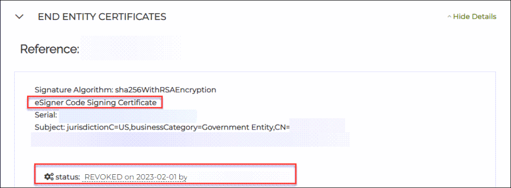 If you scroll down the page again to the section saying eSigner Document Signing/Code Signing Certificate, you should see the status showing “REVOKED” and the date when you actioned it.