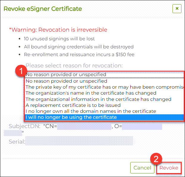 If your certificate is issued exclusively within the eSigner cloud environment and you revoke eSigner, this action will revoke the entire certificate, not just the eSigner service. As a result, the certificate will become immediately unusable.