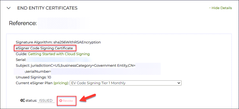 If your certificate is issued exclusively within the eSigner cloud environment and you revoke eSigner, this action will revoke the entire certificate, not just the eSigner service. As a result, the certificate will become immediately unusable.