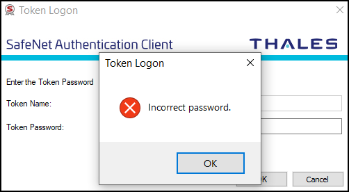 When attempting to sign your file on SignTool and you placed the wrong token password, this message will appear: Incorrect password.When you have exceeded the maximum number of logon attempts allowed, the following message will appear: The token is locked as a result of too many failed logon attempts. Contact your administrator.