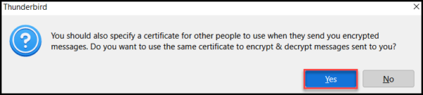 - A message box will appear with the content below. Click Yes to confirm that you will use the same certificate to encrypt your emails.