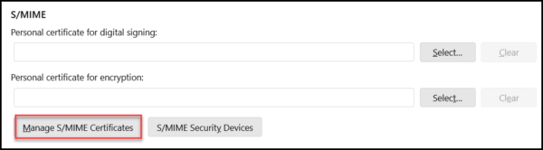 - Scroll down to the S/MIME section and click the Manage S/MIME Certificates button.