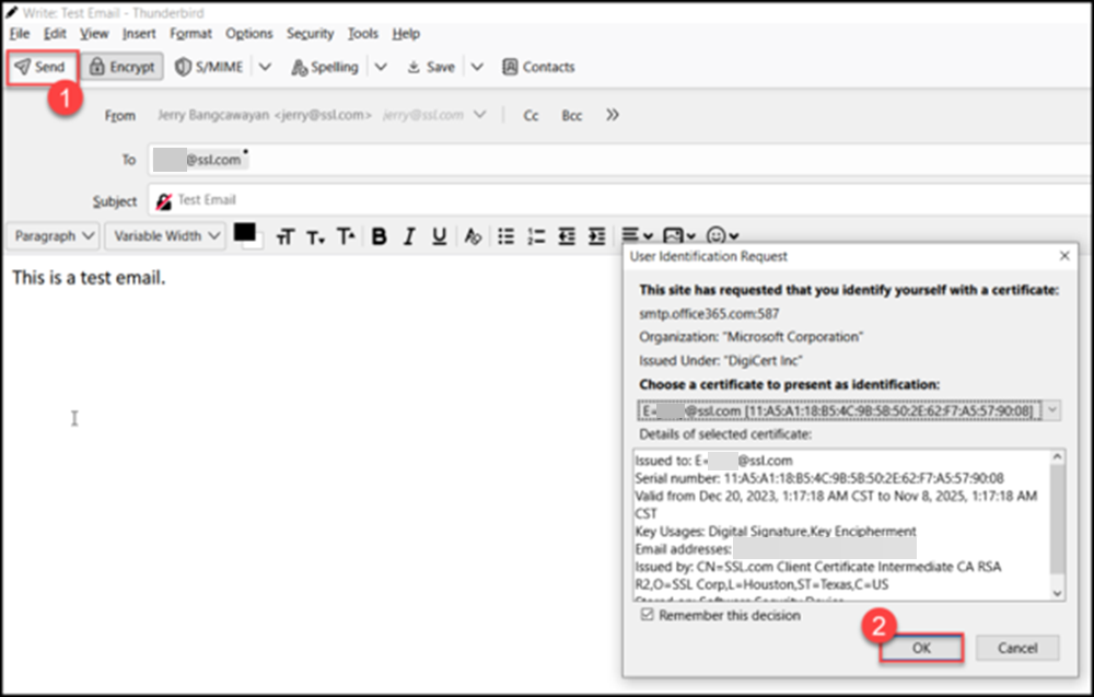 - After setting your email message to be encrypted and/or signed, click Send. Thunderbird will then prompt you to confirm that you want to use your S/MIME certificate for encryption and/or signing. Click the OK button to confirm.