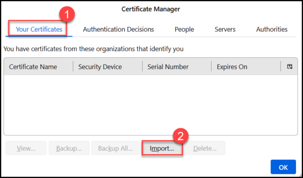 - Under Your Certificates, click the Import… button.