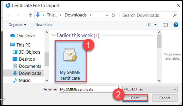- Locate your S/MIME certificate that is PKCS#12 or pfx format and then click the Open button.