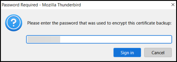 - Enter the password you previously created to download your S/MIME certificate from SSL.com. Afterward, click the Sign in button.