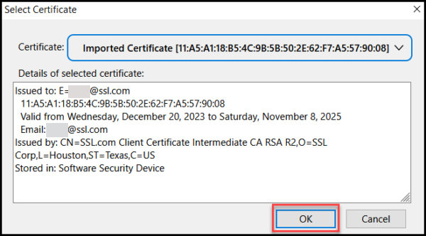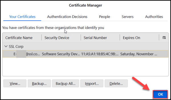 - You should now be able to view the details of your S/MIME certificate on Certificate Manager. Click the OK button to proceed.