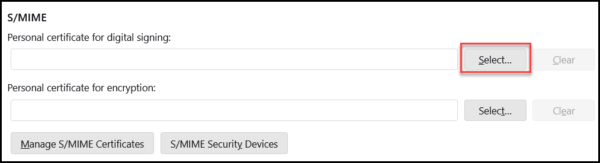 - Under the S/MIME section, click the Select… button to choose your certificate for digital signing and encryption.