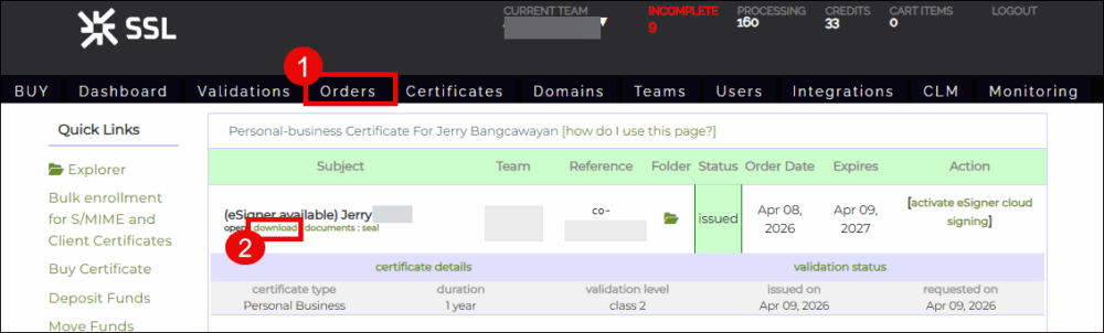 - Once SSL.com approves your attestation and issues the certificate, it can then be downloaded from your user account. To do this, click Orders from the top menu. Locate your certificate order from the list and click the download link.