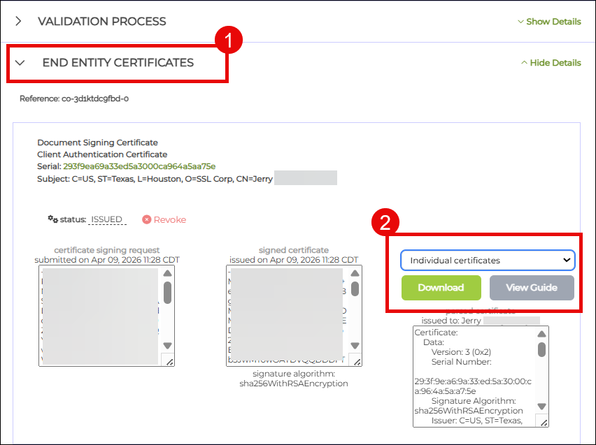 - Once on the download page, scroll down to END ENTITY CERTIFICATES section and click Show Details. Scroll down to the subsection labeled Document Signing Certificate. To the right, you will see the download format options for your certificate. For a Document Signing Certificate, choose the individual certificates download option. This is a zip file containing three certificate files: your end-entity certificate, an intermediate certificate, and a root certificate.
