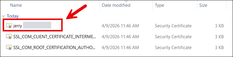 - Open the folder containing the extracted certificates. You will see three certificates but you will only need to install your end-entity certificate which is a .CRT file and bears the name of the person or organization. From here, you are now ready to install your certificate.