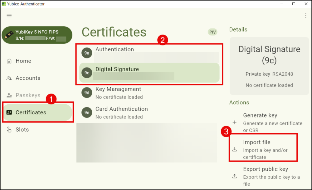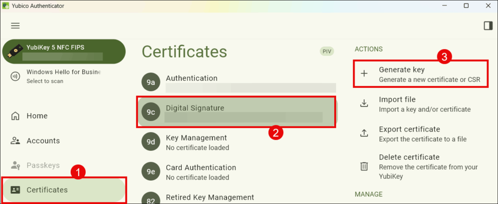 - Under the Certificates section, select the tab corresponding to the YubiKey slot where you intend to generate the key pair. For signing PDF documents, select Digital Signature (slot 9c). Click on Generate Key to proceed.
