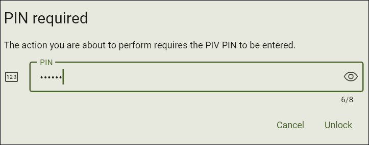 - When asked for your YubiKey PIN, enter the value then click Unlock.