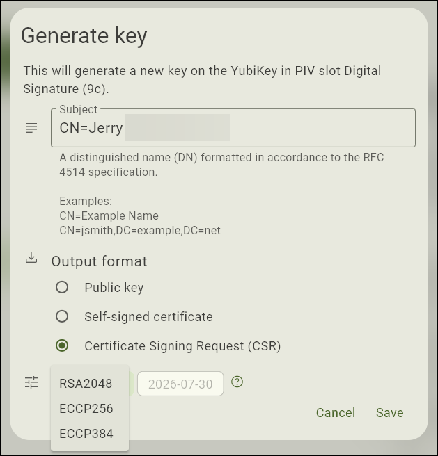 CN=on the Subject field. Yubico Authenticator will reject the CSR if this is not done. - Select a supported algorithm: RSA 2048 is the the only algorithm accepted for document signing certificates.
