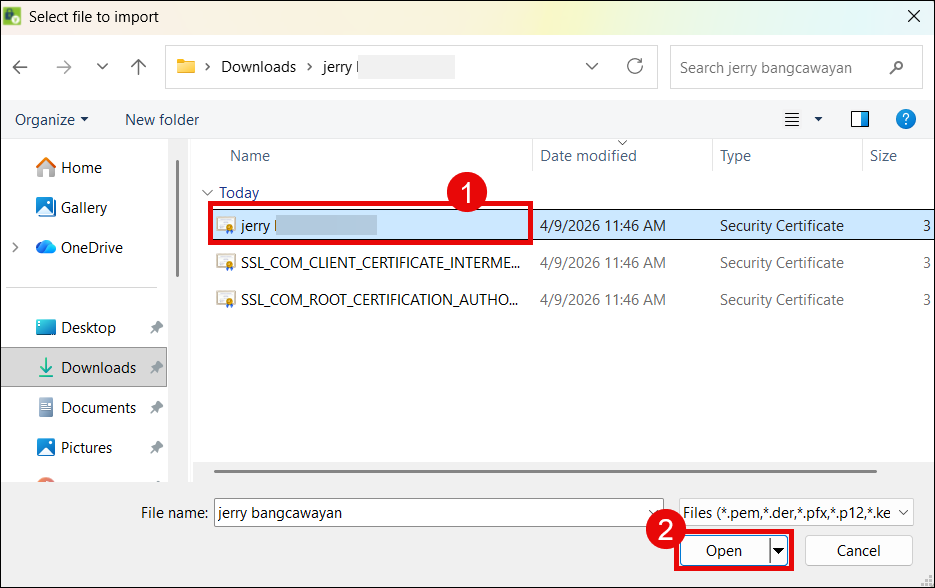 - Navigate to the folder where the certificates were extracted and click your end entity document signing certificate.