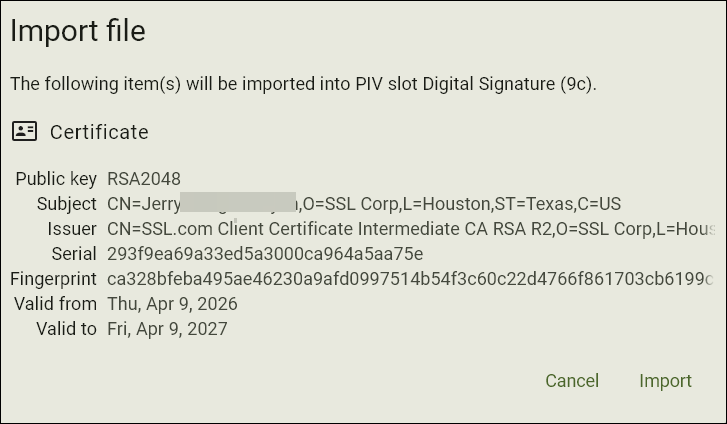 - Yubico Authenticator will display the details of your certificate. Click Import button.