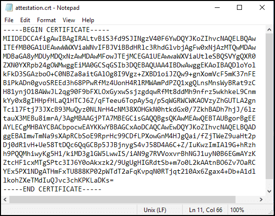 After entering the command, check in your designated computer folder if the attestation certificate was successfully generated. It will be in the form of a text file and bear the name you set for it. When opened, it will display a body of letters and numbers headed by —–BEGIN CERTIFICATE—– at the top and —–END CERTIFICATE—– at the end.