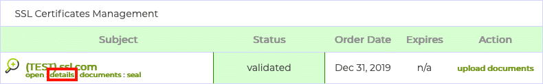 - Login to your SSL.com user account and navigate to the Orders tab. Click the link labeled details (for new orders) or download (for old orders) for the order you wish to associate with the attestation certificate. (This link will appear as download for customers with an expired signing certificate that they want to replace).