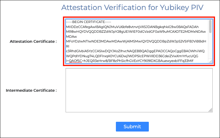 - Paste the attestation certificate into the Attestation Certificate field, making sure to include the lines