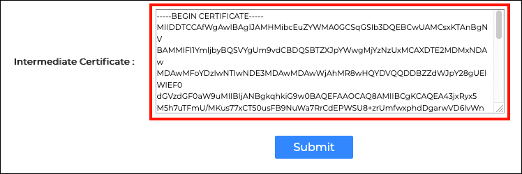 - Next, paste the intermediate certificate into the Intermediate Certificate field.
