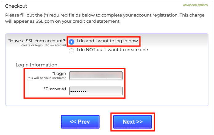 4. If you are not already logged into your SSL.com account or do not have an account yet, you will be prompted to login or create a new account at the Checkout screen. If you have an account, select I do and I want to log in now, enter your username and password, then click the Next >> button.