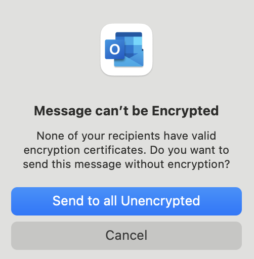 Message can’t be Encrypted None of your recipients have valid encryption certificates. Do you want to send this message without encryption?