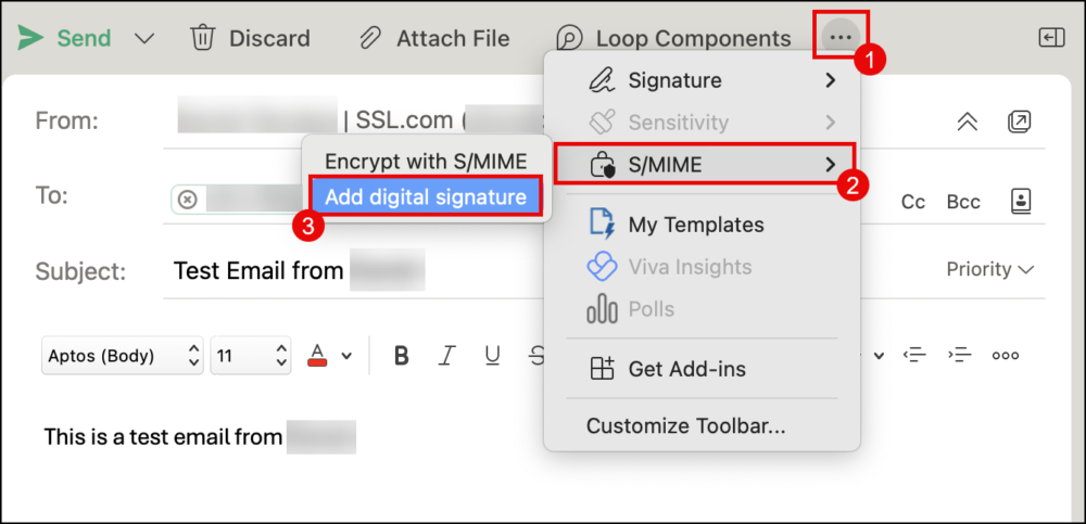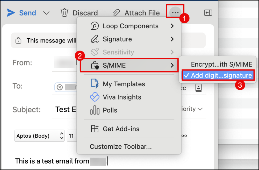 1. Create a new email message. Click the ellipsis (three dots) to display the option for S/MIME. Check Add digital signature but do not check Encrypt with S/MIME.