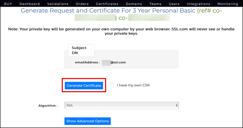 2. The link will take you to a page where you can generate your certificate. When retrieving your certificate, you have the option to select either RSA or ECDSA algorithms from the Algorithm selection menu. Nevertheless, it is advisable to opt for RSA, as ECDSA keys cannot be used for email encryption. Proceed to click the Generate Certificate button.