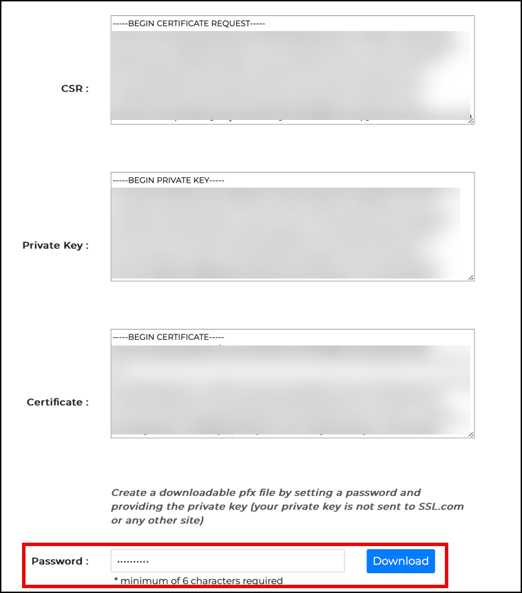 To save a PFX file with your new certificate and private key onto your computer, first set a password with at least 6 characters, then click the Download button. Make sure to remember this password, as you will need it to install the certificate and key on your computer.